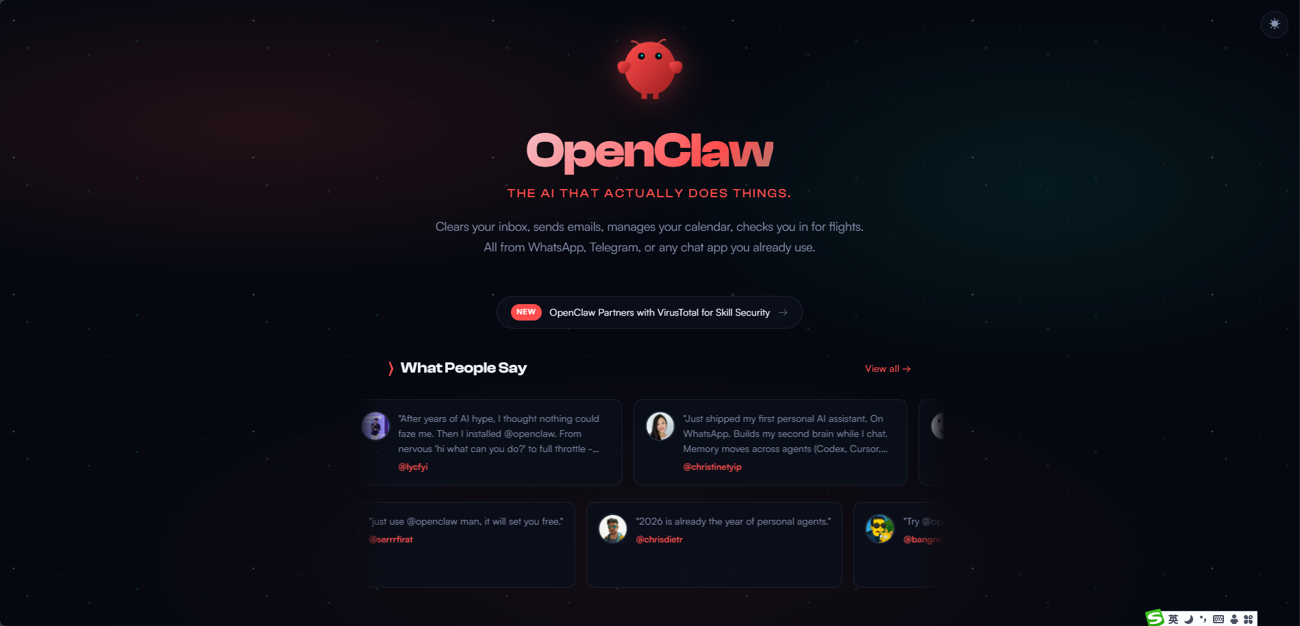 官网首页:顶部展示“OPEN SOURCE • SELF-HOSTED • 100+ INTEGRATIONS”核心标签,突出开源、自托管、多集成三大优势;中间展示 OpenClaw AI 核心定位,下方分模块呈现核心功能、安装方式、支持平台等内容,整体简洁清晰,重点突出实操性。